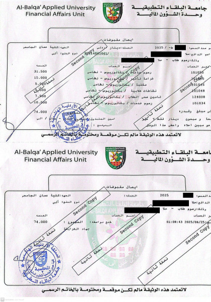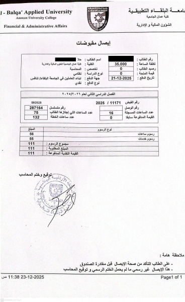 كما تم دفع مبلغ 111 دينار لحلا لتسجيل 16 ساعة دراسية على الفصل الثاني لسنة 2025/2026 وبذلك يتبقى مبلغ 52 دينار سوف يتم دفعهم على الفصل القادم عند بدء تسجيلها.