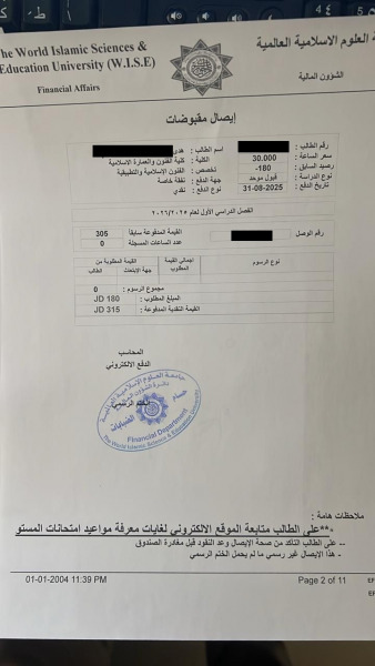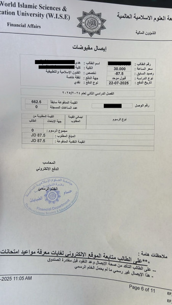 وبعد ذلك تجمع مبلغ آخر وهو 325 دينار فتم دفعه لجامعتها وكان جزءًا من تسجيل 18 ساعة دراسية على الفصل الدراسي الأول لسنة 2025/2026.