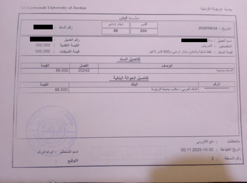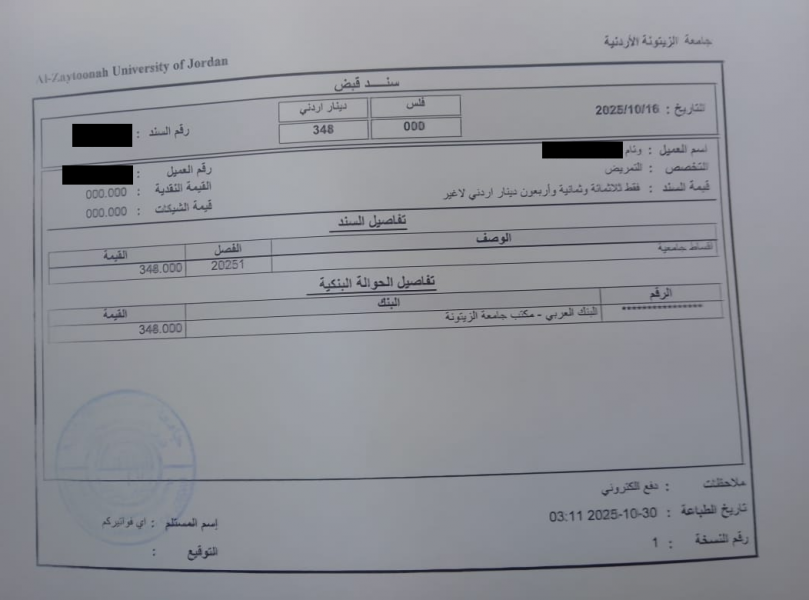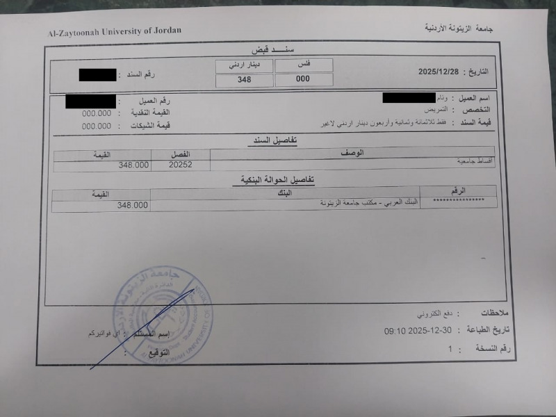 لقد تم على عدة مراحل دفع مبلغ 89 دينار لجامعة وئام ومن بعدها مبلغ 350 دينار ليكونو جزءًا من سداد مبلغ الذمم المتراكم عليها في الفصول الدراسية السابقة.