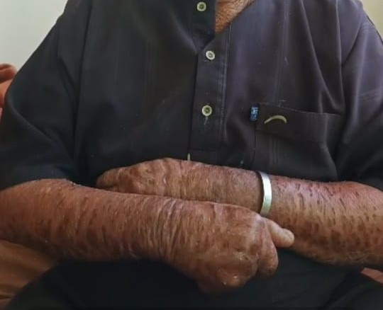 Ibraheem, 58 years old, was born with ichthyosis, a skin disorder that causes severe dryness and constant scaling of the skin. Although its appearance can be painful to look at, the disease is not contagious. Ibraheem has lived his entire life coping with this condition, accepting God’s will with patience and never allowing the illness to stand in the way of his life or dreams.