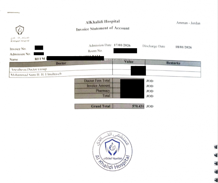 On 17/01/2026, Reem successfully underwent internal and external hemorrhoid surgery at Al-Khalidi Hospital, which had been causing severe bleeding. She is now in the recovery phase at home.